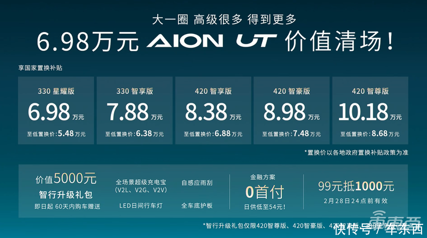 在购车职权方面,埃安UT订金99元抵1000元购车尾款的订金礼将无间到2月28日24点,让预售价进一步镌汰。同期,埃安UT还提供了0首付的金融有诡计。