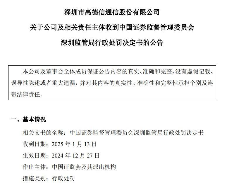 日前,深圳市高德信通讯股份有限公司(以下简称“高德信”)发布公告称公司收到证监会深圳监管局(以下简称“深圳证监局”)的行政事理。据悉,高德信因信披违规、诈骗刊行被深圳证监局重罚1000万元。