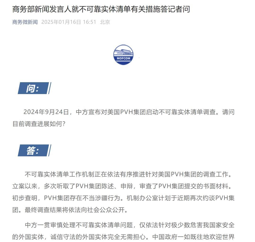 1月16日,商务部发布公告,弗成靠实体清单责任机制正在照章有序鼓舞针对好意思国PVH集团的打听责任。立案以来,屡次听取了PVH集团述说、辩说,审查了PVH集团提交的书面材料。初步查明,PVH集团存在不妥涉疆看成。机制办公室指标于近期再次约谈PVH集团。最终打听成果将照章向社会公众公开。