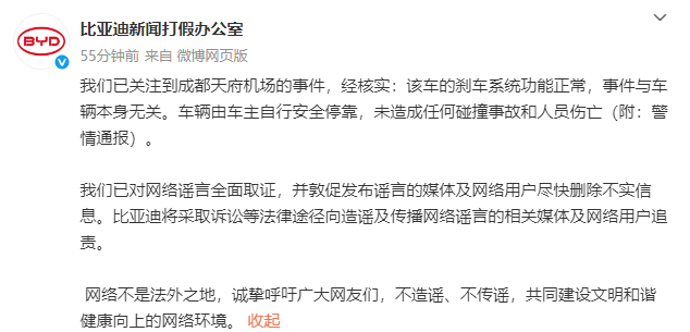对此,比亚迪新闻打假办公室暗示,已对采集坏话全面取证,并敦促发布坏话的媒体及采集用户尽快删除子虚信息。比亚迪将收受诉讼等法律路子向责备及传播采集坏话的有关媒体及采集用户追责。