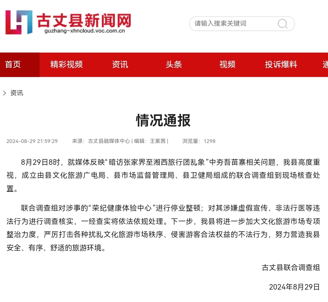 29日晚,湘西州古丈县新闻网发布通报,称古丈县对媒体报说念情况高度爱重,在29日上昼由文旅局、阛阓监管局、卫健局开荒勾通访问组,赶赴现场核实经管,对涉事的“荣纪健康体验中心”进行歇业整顿;对其涉嫌失误宣传、违游记医等违纪活动进行访问核实,照旧查实将照章依规处理。下一步,古丈县将进一步加大文化旅游阛阓专项整治力度,严厉打击多样滋扰文化旅游阛阓秩序、侵害旅客正当权利的违警活动。