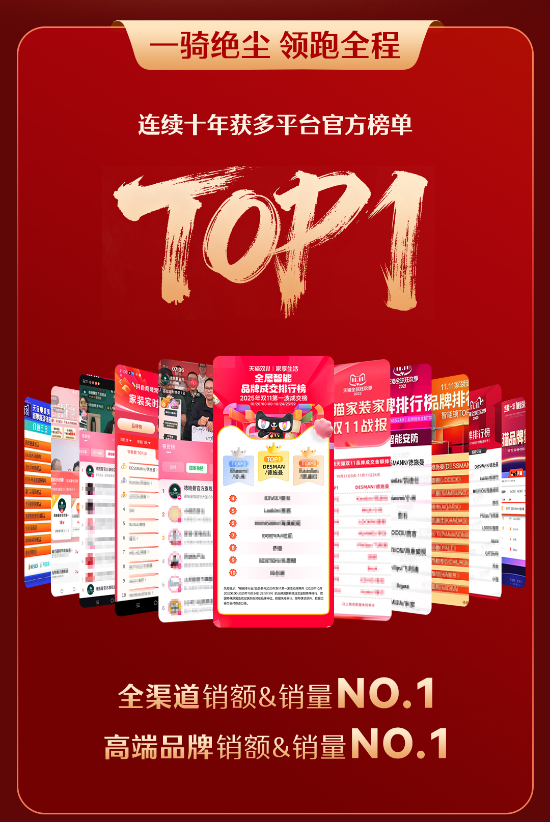 本年双11,德施曼在AI管家智能锁、哨兵猫眼智能锁、双摄猫眼智能锁、东谈主脸智能锁、可视大屏智能锁、猫眼智能锁、全自动智能锁七大热点类目中销额&销量实力登顶,市占率遥遥跳跃,捏续领跑行业。