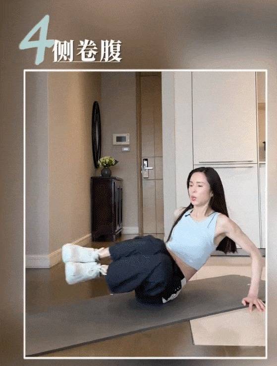 第四个算作‘侧卷腹’:中枢收紧发力,双手和臀部仅作念因循,背部挺直,不要驼背,收腿时吐气,踢腿时吸气,每组30下,左右轮流作念3组。