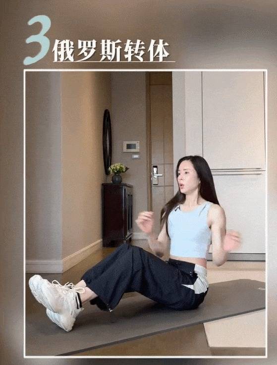 第三个算作‘俄罗斯转体’:臀部、双脚后随着地,中枢收紧发力,左右动掸腰腹,保捏呼吸均匀,每组30下,作念3组。