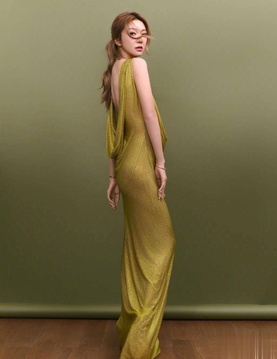 转到第四张的背影,更是让东说念主惊艳。金色投降的背部策画特有,垂坠的面料跟着体态当然舒展,勾画出唯妙的背部弧线。头发松松地挽起,几缕发丝当然垂落,增添了几分随心与柔好意思。从背影王人能感受到她由内而外懒散的优雅气质,这便是岁月千里淀下来的特有韵味吧。