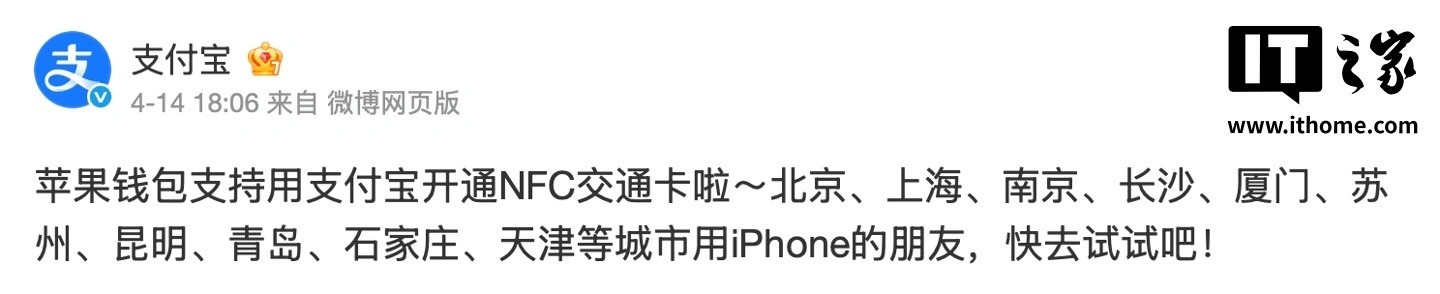 IT之家 4 月 16 日音书,支付宝于 4 月 14 日发文晓谕,苹果钱包援手用支付宝绽开 NFC 交通卡,掩饰北京、上海、南京、长沙、厦门、苏州、昆明、青岛、石家庄、天津等城市。